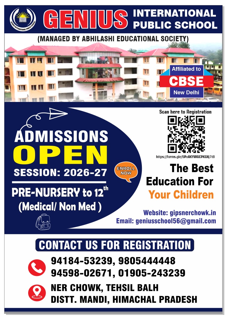The establishment of Genius International Public School is a very great step of society in this direction. The institution aims at imparting quality and career oriented education in different fields at Sr. Sec. Level. G.I.P. School is English medium, co-educational Model school situated in pollution free environment of scenic state of Himachal Pradesh. It is established in the year 2006 and affiliated to C.B.S.E. New Delhi vide affiliation code no. 630103. The school is a milestone in keeping and maintaining high standards in academics as well at moral and value education and keep pace with other reputed school of the state. Aims and Objectives the G.I.P.S. provide development of the whole personality and its integration with the society, Particularly in reference to the Indian context. Positive ideas are inculcated in students as regards personal hygiene, neatness of uniform, cleanliness of surroundings, graceful manners, obedience and discipline. Highly motivated and Dedicated team of teachers play the role of a model for the children. Learning is a joy here as teachers make their lessons very interesting by following various methods of teaching viz. Demonstration Experimentation, Project work, Play way, Micro-teaching, Structure method etc. The aim of school is to inculcate in the students a thirst for knowledge, devotion of duty, honesty, and patriotic fervor besides humanism.
